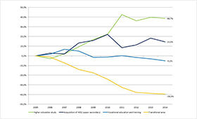The Integrated Training Reporting System also makes it possible to undertake a more detailed consideration of development in the separate sectors, including differentiated by individual so-called learning accounts. For the sector of vocational education and training, which encompasses all education and training courses leading to a full vocational qualification, it is clear that the number of entrants has decreased by a total of 5.2 per cent since 2005. This does not, however, affect all learning accounts equally. Whereas the number of entrants in the healthcare, education and social occupations (including registered general nurse and geriatric nurse) has risen, there has been a significant fall since 2005 in other fully qualifying training courses, such as those offered at full-time vocational schools (cf. here also DIONISIUS/ILLIGER 2015).