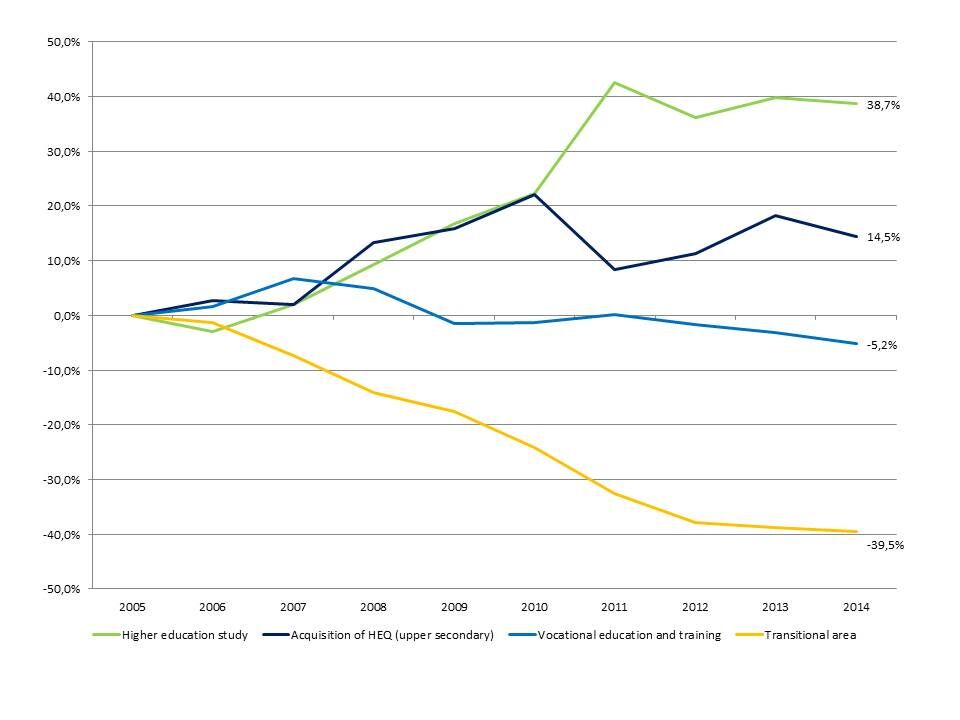 Figure 2 shows the increasing numbers of persons commencing higher education study since 2005. The numbers of those entering the transitional sector have also fallen significantly since 2005.