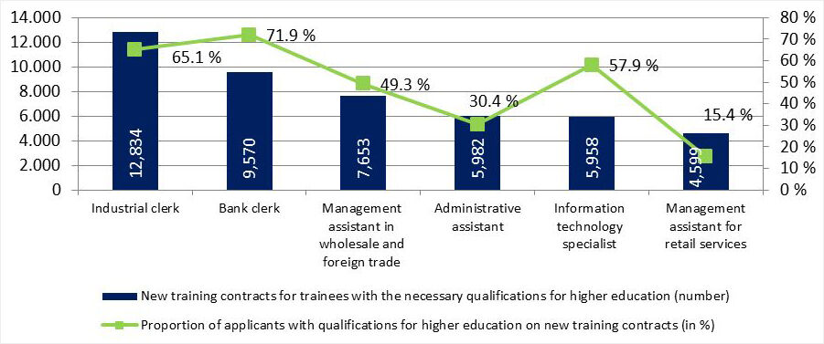 Commercial career paths are particularly appealing to young people with qualifications for higher education. When it comes to new training contracts for trainees with the necessary qualifications for higher education, five of the six most popular training occupations are within the commercial sector. The proportion of applicants with qualifications for higher education on new training contracts is considerably lower than 50 per cent in only two of these occupations (administrative assistant and retail salesperson) (cf. Figure).