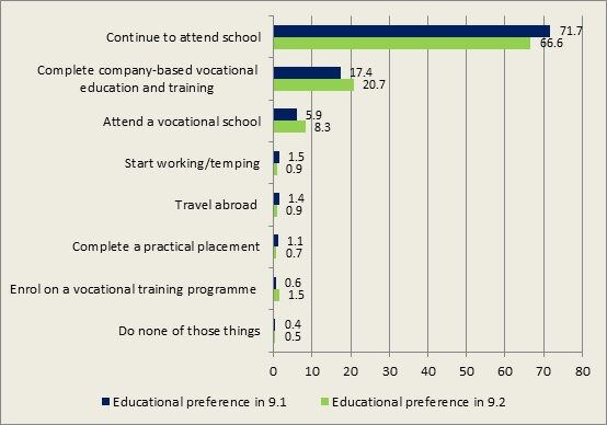 Figure 1: Realistic educational preferences in the period after Year 9 in the first (9.1) and second (9.2) semester (figures in %)