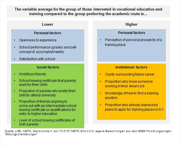 To find out which pupils are interested in dual VET at the end of Year 9, T-tests are devised to compare the group of potential training place applicants and the group preferring to remain at school (cf. Figure 2). These tests take personal factors (such as socio-demographic, dispositional and academic characteristics) into consideration along with influences from the social environment and the institutional context, including the career orientation process. Other institutional aspects are portrayed as proxies by young people’s subjective assessments of success and prospects and categorised under personal factors.