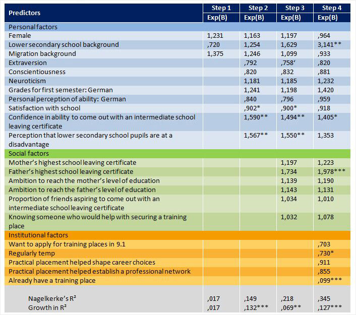 The socio-demographic variables alone have no direct impact on the likelihood of a change in preference (Step 1). Only the lower secondary school visit – in conjunction with social variables and the career orientation and application processes – demonstrates an effect in Step 4 that lower-level secondary school pupils are more likely to change their preference in favour of staying at school.