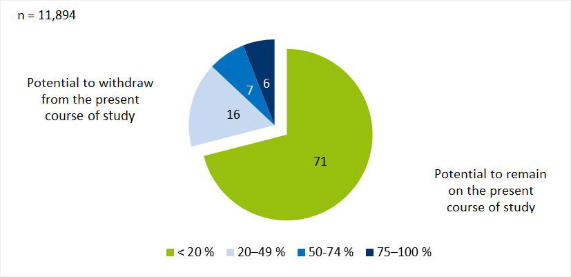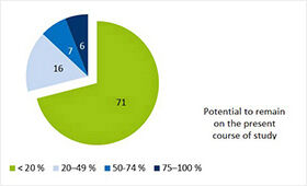 On a scale of 0 to 100 per cent, students were asked to estimate how likely they were to leave their present course of study without graduating. Seven out of ten respondents indicated that the likelihood of them dropping out was rather low at less than 20 per cent. One in six, however, suggested that the likelihood of them ending their studies early was between 20 and 50 per cent, while one in eight revealed a probability of over 50 per cent (cf. Figure 1). In total, 29 per cent of those who took the survey can be classified as being doubtful about their studies or a potential drop-out.