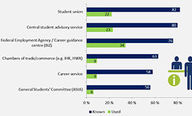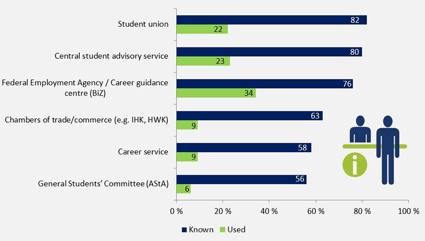 The survey also includes information on the type of information and guidance services available. 61 per cent of all higher education doubters indicate that they feel either quite-poorly or poorly informed about the options of transition to a dual training programme. Despite being entirely familiar with the existing information and guidance services, they hardly ever make use of them (cf. Figure 2). Studentenwerk [Student services] is the best-known resource for guidance (at 82 %), although it is only used by one in five higher education doubters. The guidance provided by the Bundesagentur für Arbeit (BA) [Federal Employment Agency] and associated Berufsinformationszentren (BiZ) [career guidance centres] is sought out most frequently (34 %), and three quarters of doubters know it exists. Although at least 63 per cent of doubters know that the various chambers have information and guidance to offer, only nine per cent of those surveyed actually take advantage of this service. Demand for guidance from these chambers does, however, increase slightly in line with the probability of dropping out (demand of barely 8 % at a probability of 20 – 49 % compared to a demand of 11 % at a probability of over 75%).