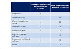 More than two thirds of higher education doubters without initial VET cannot envisage themselves starting company-based education and training after deciding to leave their degree course; however, from a VET perspective, this same group is a particularly interesting target category when it comes to taking on those quitting their studies.
