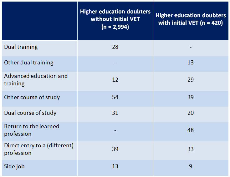This reveals that training provisions with company-based elements are viewed as a viable alternative to their current course of study. For higher education doubters who have not completed their initial VET, company-based education and training and the dual course of study are considered potential options at around 30 per cent each. The same value also applies to advanced vocational training among higher education doubters who have completed their initial VET. Nevertheless, the option of dual VET remains significantly less likely than a direct transition into the employment system without VET qualifications, which 39 per cent of higher education doubters are considering (cf. Table).
