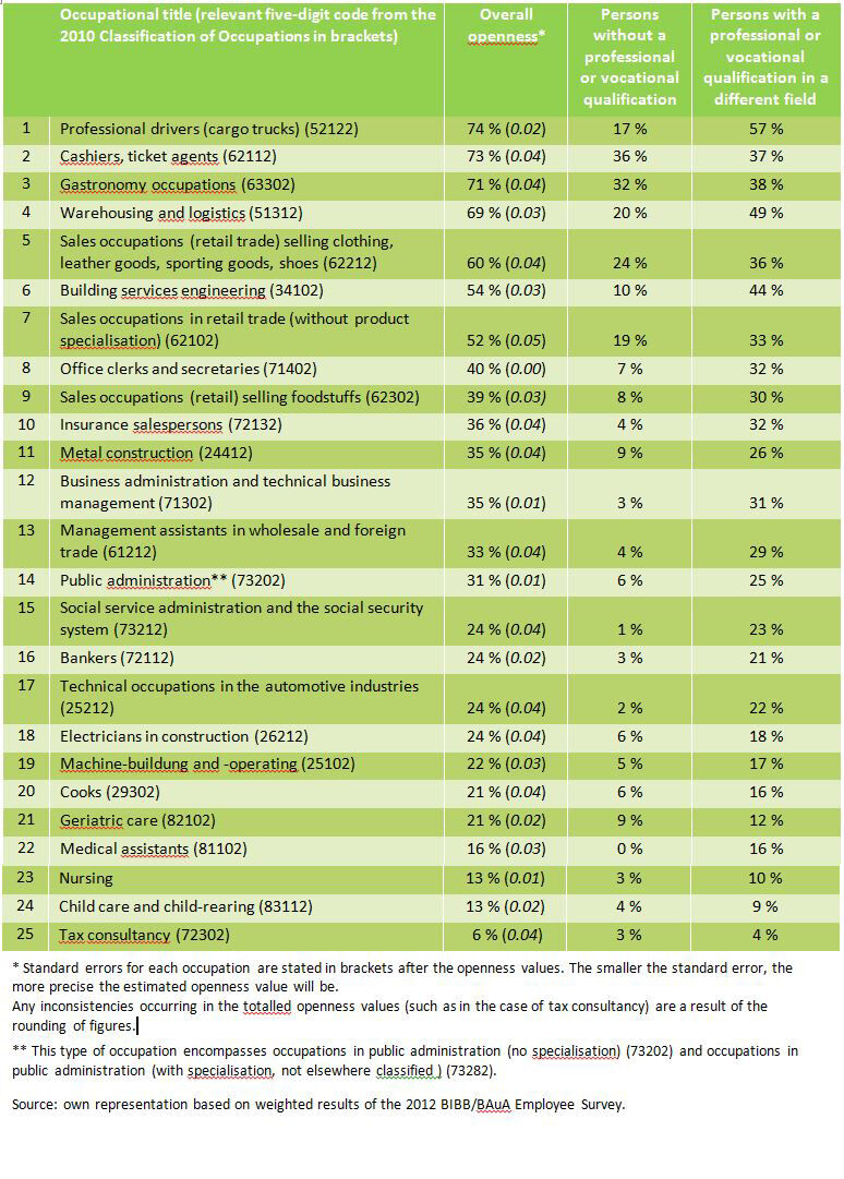The table shows very different levels of openness according to occupation. Professional drivers (74 %), cashiers and ticket agents (73 %), gastronomy occupations (71 %) and warehousing workers (69 %) all exhibit values of around 70 per cent and can be identified as particularly open occupations. By way of contrast, tax consultants (6 %), childcare workers (13 %), nurses (13 %) and medical assistants (16 %) all have scores of under 20 per cent and may be described as highly closed.