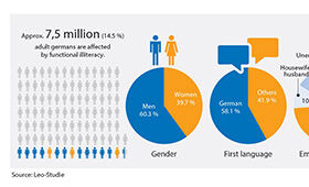 Rising requirements in the workplace also mean that employees need to offer increasing skills. The same applies to low-qualified persons in low paid sectors and to job seekers. Such persons often, however, face problems because they cannot read or write properly. 7.5 million people in Germany are functionally illiterate. More than half of these are in work and more than half are also in possession of an accredited vocational certification (cf. Figure).