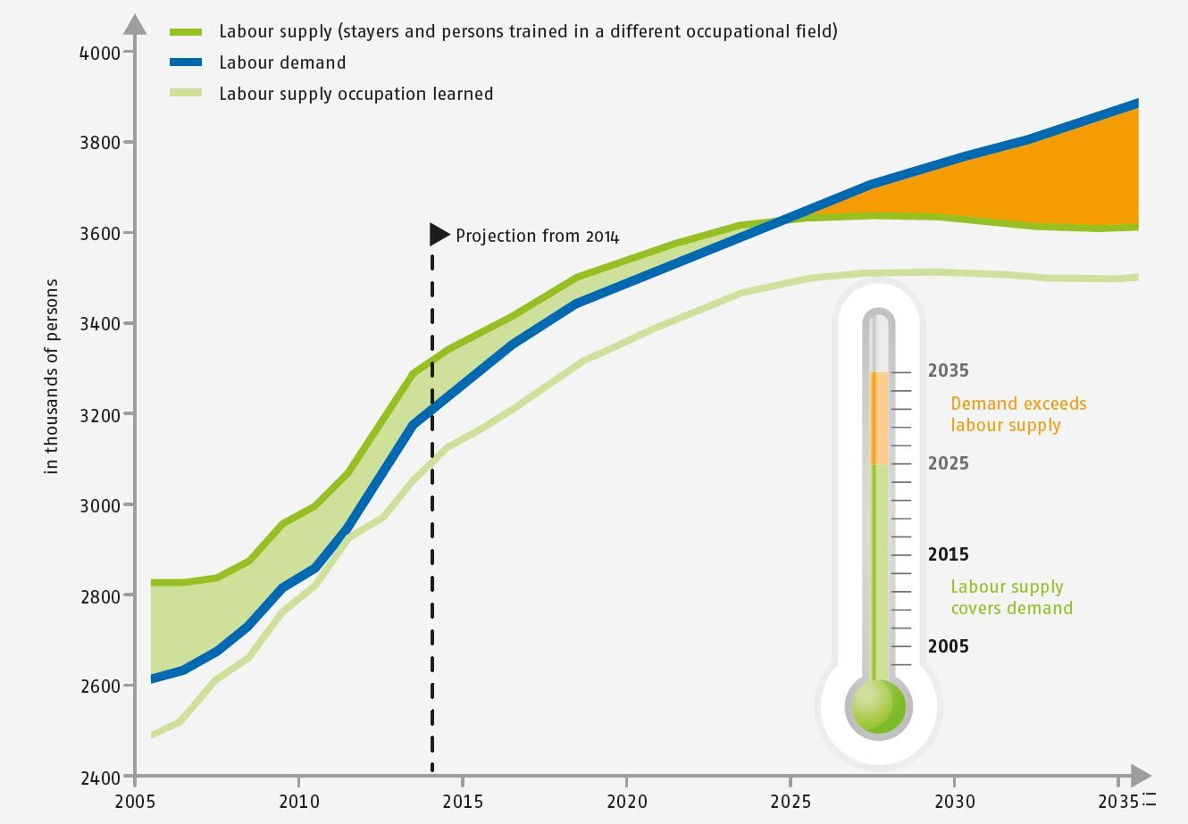 As illustrated by the figure, the labour supply of persons trained in occupations not requiring a medical practice licence was not even sufficient to cover demand in the past. This is by no means unusual. In most occupational fields, demand can only be met by persons who have completed training in a different profession or who are not in possession of any vocational qualification at all. However, because of the high degree of regulation that applies to work entitlement in the field of nursing in particular, the number of persons from other occupational fields available to the nursing and healthcare professions is relatively low. Nevertheless, their deployment has secured an adequate supply of workers up until now, although regional and occupation-specific shortages cannot be ruled out. Notwithstanding this, the projection reveals that a national shortage of workers could occur as early as the year 2025. By 2035, the shortfall would be as many as approximately 270,000 employees. This shortage could not even be resolved by longer working times because capacities based on numbers of hours would also be exhausted.