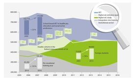 The vocational education and training sector shows an increase until 2007. Entrant numbers have been falling since the beginning of the economic crisis in 2008. Compared to the base year of 2005, a decrease of five per cent (- 34,000) has been recorded in this sector. Within this context, consideration needs to be accorded to the fact that dual vocational education and training in accordance with the BBiG/HwO has been in decline (- 7%), whereas there has been particularly strong growth in the school-based VET programmes offered in the healthcare, education and social sector professions (+ 22%).