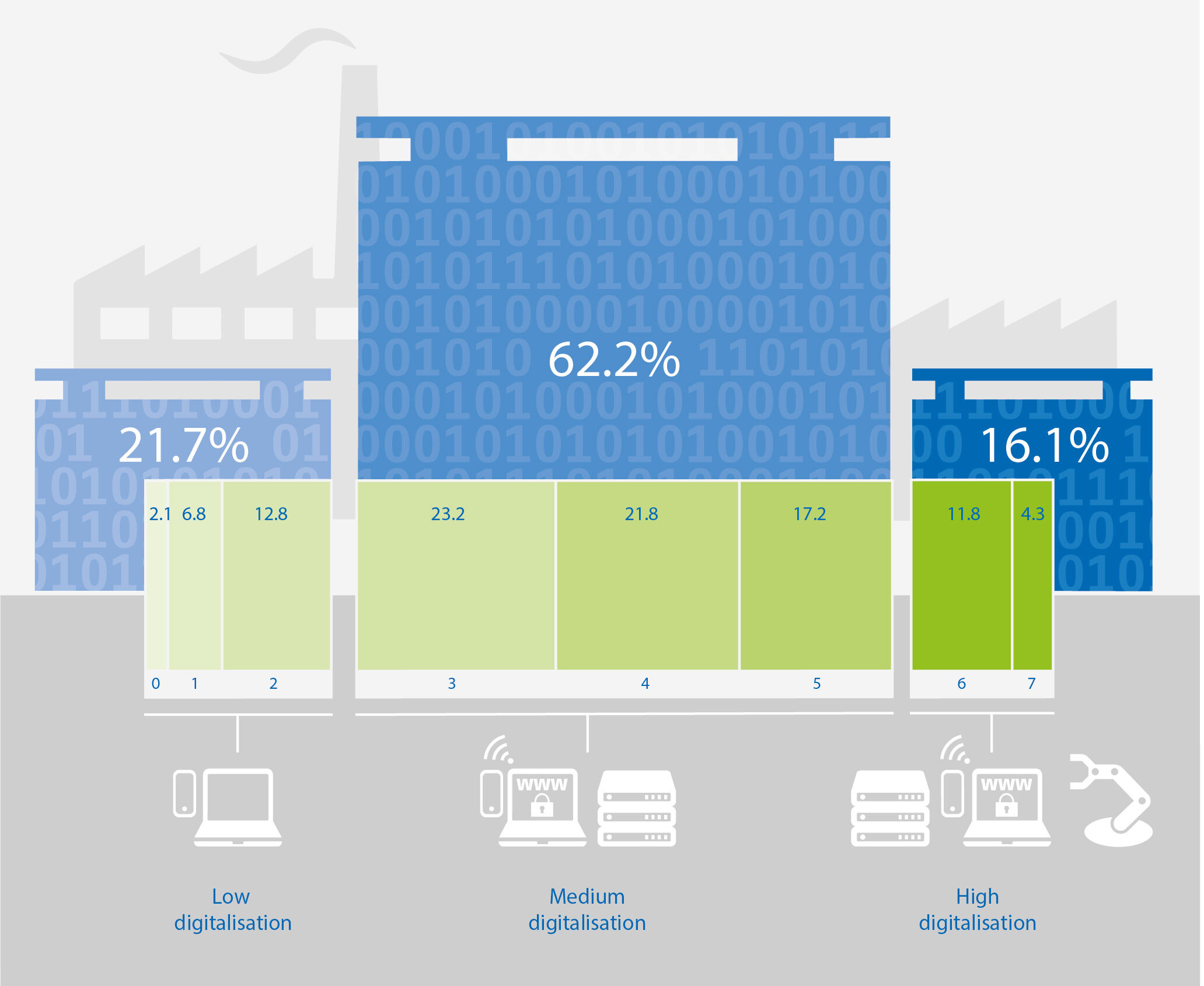 The degree of company digitalisation is calculated from the total of technologies used at the firm. Level one comprises companies with one or two instances of use of digital technologies. This produces an eight stage index, which extends from “no digitalisation” (0) to “very high degree of digitalisation” (7). Figure 1 shows how SMEs are distributed across the index.