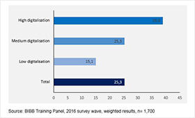 If we consider human resources or recruitment strategies against the background of the respective degree of digitalisation, no significant relationship between degree of digitalisation and instances of new recruitment can be identified. By way of contrast, employees at companies with a higher degree of digitalisation are more likely to take part in upgrading training. These programmes foster both professional skills and the digital competencies which are becoming increasingly necessary within the occupation. In conjunction with the completion of higher formal training, these competences open up new career opportunities for employees. Upgrading training may result in an expanded area of tasks and responsibility as well as enhancing wages. For their part, the companies obtain skilled staff who are able to offer the skills required to deal with new digital technologies. For SMEs in particular, which usually do not have the same financial resources at their disposal as large enterprises, this may deliver a significant competitive edge over rival firms. The important aspect here is that advanced training contents are adapted to meet new technological developments on an ongoing basis. This enables both employers and employees to benefit from upgrading training programmes.