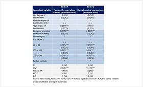 The table shows the marginal effects and the relevant fit dimensions of the logistic regressions. In the first model, a highly significant correlation between degree of digitalisation and support for upgrading training can be identified. In companies with a high degree of digitalisation, the likelihood that they will support employees with upgrading training is 9.2 per cent higher than at firms with a medium degree of digitalisation. By way of contrast, no significant difference can be ascertained between companies with a low digitalisation and those with a medium degree of digitalisation. The likelihood that companies providing vocational training will support upgrading training is also significantly higher (11.9%). This is plausible given the fact that upgrading training programmes are usually pursued as a further qualification following completion of dual VET. We can also observe that significant differences in respect of company size occur within the group of SMEs. Compared to firms with up to 19 employees, the likelihood that upgrading training will be supported is around 34 per cent higher for companies with between 200 and 249 employees, about 19 per cent higher for firms with between 20 and 99 employees, and approximately 29 higher in the case of companies with between 100 and 199 employees. This means that there is a significant rise in the probability that upgrading training will be offered once a company’s workforce is greater than 20 in number. One of the reasons for this effect is that the proportion of companies providing vocational training rises in line with increasing company size (cf. TROLTSCH 2017).