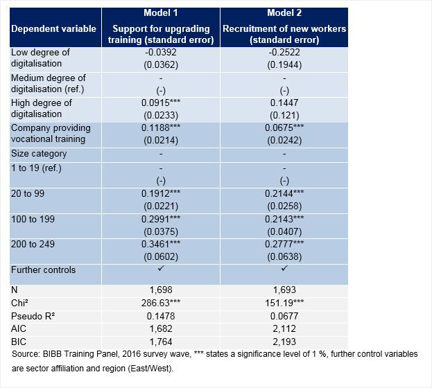 The first model investigates the influence of the degree of digitalisation of a company with regard to whether support is provided for upgrading training programmes. In the second model, the dependent variable is accordingly represented by instances of new recruitment. In addition, structural characteristics such as sector affiliation, company size, region (East or West Germany) and whether the company offers vocational training are included as control variables in order to avoid any distortions of the results.