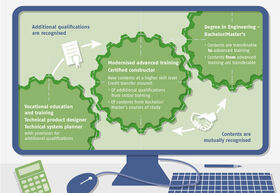 Period of implementation, costs and permeability are also important criteria for an attractive advanced training qualification alongside the actual contents to be imparted. For this reason, a concept which could potentially take account of these requirements was developed within the scope of the investigation. This concept focuses on the advanced training occupation. Parts of the qualification may be completed during initial vocational education and training and be subsequently recognised for advanced training. At the same time, contents which may be accorded reciprocal recognition could be included in the advanced training and higher education regulations. In specific terms, this means that newly developed additional qualifications that are actually acquired during initial vocational education and training could be credited to advanced training. The contents of these would need to be adapted to the examination requirements contained within the advanced training regulations. This necessitates a new way of considering the interfaces between initial and advanced training regulations.