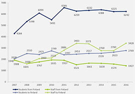 Ca. 13-14 per cent of the new students and apprentices today are going on a mobility period as a part of the studies. The greatest growth in mobility took place in the years 2007-2011 and has since stabilized (cf. Figure 1). Outgoing student mobility (2016: 6,242 in) is more than double the number of incoming mobility (2016: 2,769), mainly due to a high interest and funding options, beyond also the EU-programmes, available to Finnish students. For staff mobility the situation is the reverse: incoming mobility (2016: 3,428) is more than double that of outgoing (2016: 1,427 in), one of the reasons maybe being the global interest towards Finnish education.