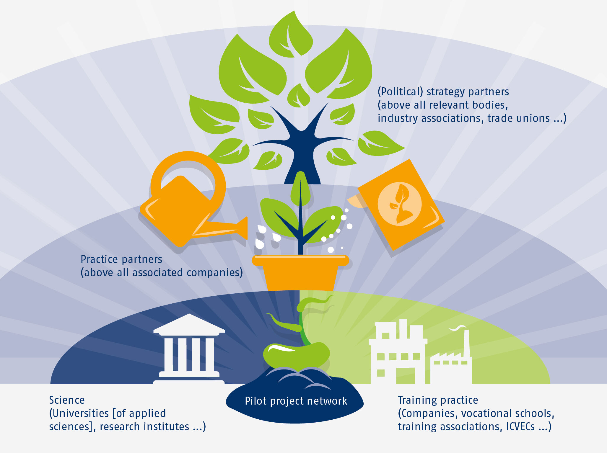 Against this background, the BMBF made funding available for a new phase of the main pilot project focus of “VET for sustainable development”. In order to facilitate moving “from the project to the structure” (DUK 2014), implementation of the policy principle at companies and transfer of pilot project results to superordinate VET structures were both declared as aims.
