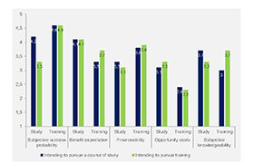With regard to the issue as to which characteristics prove relevant in connection with a decision to opt for training, the results enable the following indications to be derived for vocational orientation at upper secondary level. Firstly, both groups ascribe a high degree of benefit expectation to a course of study (e.g. a degree). A similar view on training is, however, only embraced by those interested in pursuing this pathway. Better information on the broad range of training allowances and of labour market and income prospects after completion of training, could help to enhance the attractiveness of training as an educational option. The possible labour market and career prospects offered by upgrading training should also be indicated.