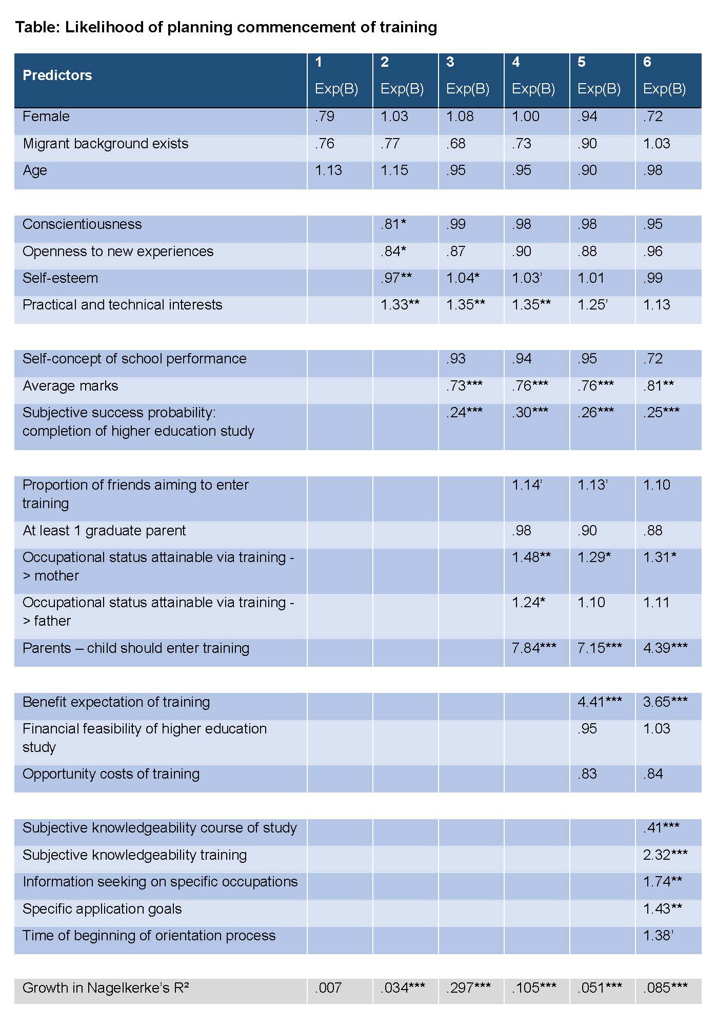 The socio-demographic variables do not exercise any significant effect on the likelihood of planning training. In contrast, the variables from the field of personality included in the second block all show an effect. Likelihood of entering training is lower if conscientiousness and openness are higher, but rises if there is a strong degree of interest in practical and technical tasks. These effects, however, disappear (Block 3 ff.) when further characteristics are entered, supposedly, because their influence is mediated by these characteristics such as school performance. Both good marks and higher self-assessed success probability with regard to higher education study reduce the likelihood of entering training. Perceived prospects of success for a programme of higher education study thus do not appear to be exclusively derived from current school performance.