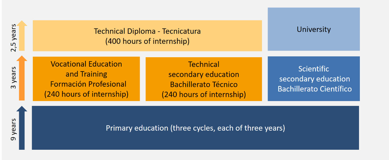 Education in Paraguay starts with early years support in nursery school and pre-school provision for children aged between 0 and 5. This is followed by nine years of free and compulsory primary education. School attendance is mandatory until the end of Year 9. Upon completion of primary schooling, young people may enter work, progress to the secondary training sector or commence intermediate level VET (cf. Figure).