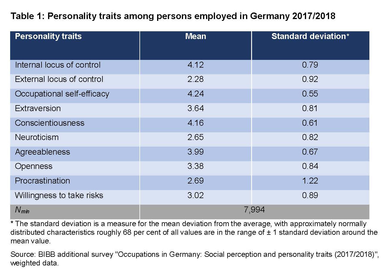 Employed persons in Germany have on average a high internal locus of control, a high occupational self-efficacy and conscientiousness with values above 4. The characteristics agreeableness, extraversion and openness are also relatively pronounced among those in employment (with mean values between 3 and 4). In contrast, the mean values for external locus of control, neuroticism and procrastination are below 3. On average, employed persons also show a medium willingness to take risks with a value of about 3.