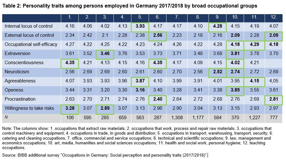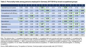 Accordingly, those employed in occupations that extract raw materials (1) in Germany are characterized by an above-average willingness to take risks and a high degree of conscientiousness. Those employed in machine-controlling occupations (3) report more frequently than other occupational groups that they are more cautious (less extraversion) and less willing to take risks. Internal locus of control, agreeableness and openness are less pronounced on average among the employed in transport, security and guarding occupations (5). Catering and cleaning occupations (6) are characterized by particularly conscientious workers and those with above-average external locus of control. They also have a lower tendency to postpone things. Employed persons in office and commercial occupations (7) tend to have medium values on all personality traits (as do occupational groups 2 and 4), but they have the second-lowest value on willingness to take risks. The employed in technical and scientific occupations (8) have on average the second lowest external locus of control of all occupational groups. Employed persons in legal, management and economic professions (9) have on average a high internal locus of control (including occupational self-efficacy) and emotional stability (low degree of neuroticism). In artistic, media, humanities and social sciences occupations (10), people more frequently claim to have low self-efficacy and conscientiousness, but have a higher degree of extraversion and openness. In addition, they claim to be less emotionally stable than other occupational groups. Employed persons in health and social care occupations (11) have the highest average values for personality traits of self-efficacy and agreeableness in the workplace, i.e. they are particularly helpful and considerate. In teaching occupations (12), employees show a comparatively high degree of procrastination and the lowest degree of external locus of control and occupational self-efficacy on average.